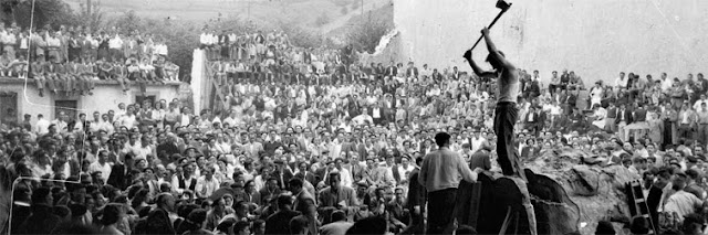 Durante la primera mitad del siglo XX los aizkolaris comienzan a ser deportistas conocidos y generan una gran afluencia de público en las plazas de toros de Tolosa, Azpeitia, Donostia y Eibar entre otros lugares. La prensa llena titulares con Santa Agueda, Atxumberria, Keixeta, Kotaberri, Arria, Corta o Luxía. Estos dos últimos aizkolaris, Antonio Soraluze “Corta” (Azkoitia, 1918) y Juan José Narbaiza “Luxía” (Azkoitia, 1921), participaron cada uno por separado en un desafío nunca antes visto. Si lo normal es que los troncos de haya para las competiciones midan de circunferencia entre 36 pulgadas “oinbetekoak” (91,44 cm) y 72 pulgadas “oinbikoak” (182,88 cm), a veces 80 pulgadas (203,20 cm) y excepcionalmente 108 “kanak” (274,32 cm), su reto consistía en tratar de cortar las dos hayas más grandes conocidas en Euskadi: el hacha frente a dos gigantes de más de 160 pulgadas.